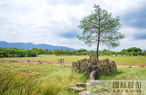 旁邊的一個樹島,用柴火和鋼管做出“鳥巢”形狀,雖稍顯“凌亂”,但卻顯得分外自然;再前方的一個樹島,增加“五指”塑石景觀,遠(yuǎn)遠(yuǎn)看去,好像一只大手托舉著大樹;穿過田間小路,來到幾棵大樹組成的樹林,錯落有致的景石形成一個自然的圍合空間,林間小路用舊木頭鋪成,道路兩邊用紫色鼠尾草、刀茅等植物巧妙搭配出清新的花境,坐在樹下的石頭上小憩,看著孩子們在追逐嬉戲,仿佛回到了兒時和小伙伴在村口大樹下游玩打鬧的時光,關(guān)于故鄉(xiāng)的回憶充盈在心間。