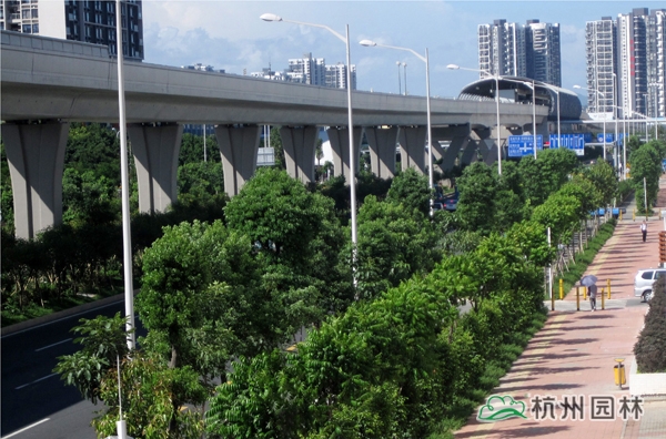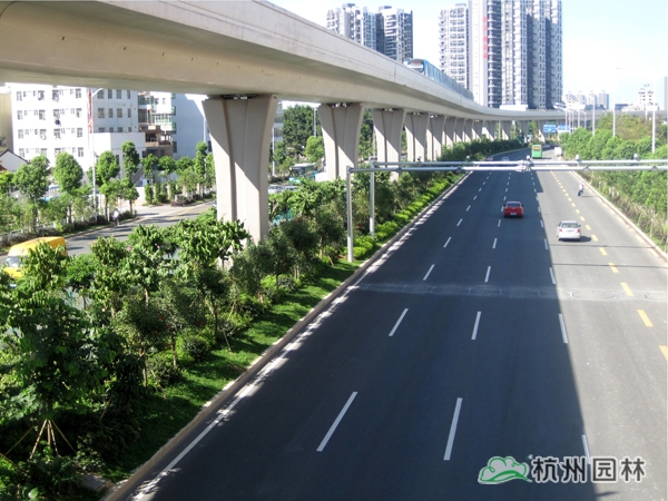 該工程位于國道205深圳段龍崗區(qū)地鐵三號(hào)線愛聯(lián)地鐵站至坪地與惠州市交界處,施工內(nèi)容包括綠化種植、綠化噴灌與管道安裝等。植物配置遵循適地適樹的原則,并充分考慮與城市風(fēng)格的吻合,兼顧多樣性和季節(jié)性,通過多層次、多品種的搭配,營造出處處有綠葉、無處不飛花,一路風(fēng)景變化萬千的城市景觀帶。