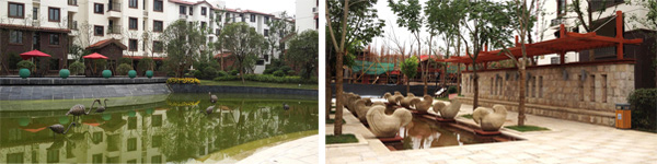 在紫荊東郡小區(qū),水景隨處可見(jiàn),從主入口兩側(cè)近50米的景觀橋水景,到入口正前方一個(gè)大型的石雕噴泉,再到小區(qū)里面幾條主干道交匯的十字路口的小型地面噴泉,中心水景上的圓形石雕噴泉,特別是不遠(yuǎn)處的動(dòng)物噴泉雕塑,只只鶴低頭凝思,細(xì)長(zhǎng)的水流從鼻端的出水口處流出,落入下方的水池里,更是格外引人注目。"這些水景小品具有的藝術(shù)特性與審美效果,加強(qiáng)了整個(gè)景觀環(huán)境的藝術(shù)氛圍,成為讓空間環(huán)境生動(dòng)起來(lái)的關(guān)鍵因素,在提高小區(qū)藝術(shù)品質(zhì)和景觀形象的同時(shí),更給人們帶來(lái)美的享受。"楊經(jīng)理如是說(shuō)。