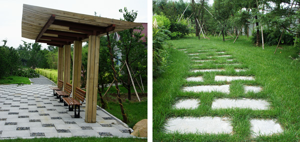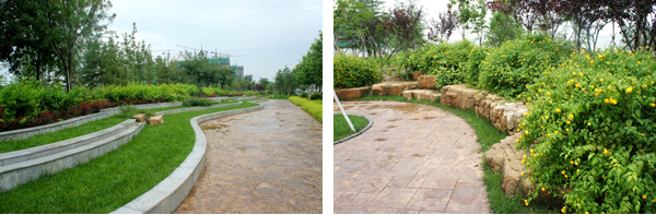 而在道路十字路口的節(jié)點處,則主要是用10cm×10cm的小花崗巖鋪地,鋪出來的路面整潔、平坦,看似簡單,實則對施工技術(shù)要求相當(dāng)高。草坪中的地面鋪裝,則采用花崗巖汀步,用錯縫鋪裝法,兩塊花崗巖之間用草皮鑲嵌,就像給每塊花崗巖鑲了一道綠邊,與旁邊的草坪和諧地融為一體。貫穿整個工程的游憩步道,全部采用"人字形"的鋪裝方法,中間用透水磚、兩邊以花崗巖鑲邊,透水磚價格不高,用以鑲邊的花崗巖是利用了鋪裝中剩余的邊料,雖然用料簡單,但通過對技術(shù)的嚴(yán)格要求,鋪出的路面卻整潔而不失韻味,是一種實用、環(huán)保、節(jié)約的做法。