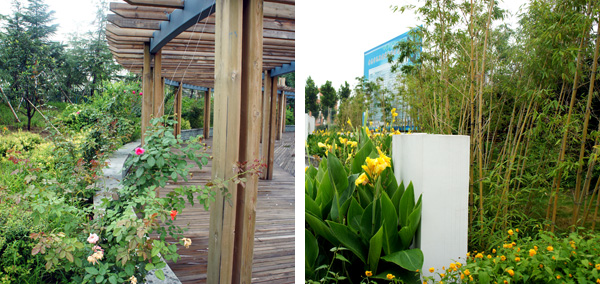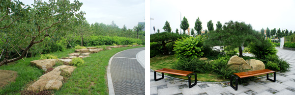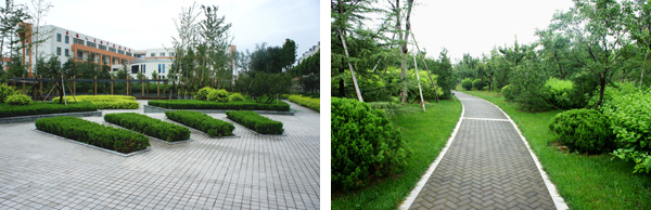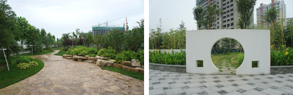 每個景觀節(jié)點上,植物的配置方法都是不一樣的,如在下沉廣場,主要是以小龍柏、金葉女貞等小灌木片植成方形或弧形,間或點綴石楠、梅樹,看起來規(guī)整、簡潔;而在設(shè)計風(fēng)格為江南園林的南廣場上,是將貴重的造型油松單植,通過不同的組合,形成三個風(fēng)格相近的綠島,周邊種植美人蕉、玉簪、竹子,并砌起白墻,上面開圓形拱門或圓窗,散發(fā)出詩意江南的靜謐和婉約氣息。"游憩步道是貫穿整個景觀的軸線,為了形成曲徑通幽的景觀效果,我們將對植、孤植、叢植都多種方法結(jié)合運用,特別是在三叉路口,多種植海棠、櫻花、杏花等,一方面,花開的時候,綠葉間繁花點點,會吸引人們不斷向前探尋更多的美景;而花落之后,茂密的枝葉又形成隱隱約約的視覺感受,前方轉(zhuǎn)過彎后風(fēng)景什么樣,又讓人很想去看看。"高經(jīng)理笑著說。