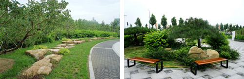 而在道路十字路口的節(jié)點(diǎn)處,則主要是用10cm×10cm的小花崗巖鋪地,鋪出來的路面整潔、平坦,看似簡單,實(shí)則對施工技術(shù)要求相當(dāng)高。草坪中的地面鋪裝,則采用花崗巖汀步,用錯(cuò)縫鋪裝法,兩塊花崗巖之間用草皮鑲嵌,就像給每塊花崗巖鑲了一道綠邊,與旁邊的草坪和諧地融為一體。貫穿整個(gè)工程的游憩步道,全部采用“人字形”的鋪裝方法,中間用透水磚、兩邊以花崗巖鑲邊,透水磚價(jià)格不高,用以鑲邊的花崗巖是利用了鋪裝中剩余的邊料,雖然用料簡單,但通過對技術(shù)的嚴(yán)格要求,鋪出的路面卻整潔而不失韻味,是一種實(shí)用、環(huán)保、節(jié)約的做法。