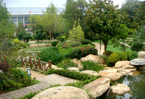 自然式駁岸讓人工湖更具野趣,大小不一的天然景石成組擺放。從岸邊到水中,陸地植物、濕地植物、水生植物依次“排列”,以最淳樸的方式演繹著自然規(guī)律。水邊大量栽種柳樹,輕柔的枝條隨風(fēng)搖擺,旁邊搭配清香木、雞爪槭等耐水濕喬、灌木,豐富的葉色、優(yōu)美的姿態(tài)將普通的湖岸裝飾一新。對于湖面較大的部分,僅在湖體四周以塊狀方式種植水生植物或濕生植物,中央?yún)^(qū)域則不種植水生植物,以擴(kuò)大空間感,使得樹木、建筑物能夠形成完整的倒影,成就優(yōu)美的“水中畫”。