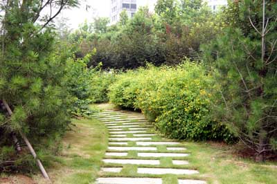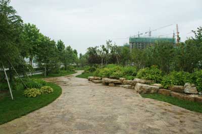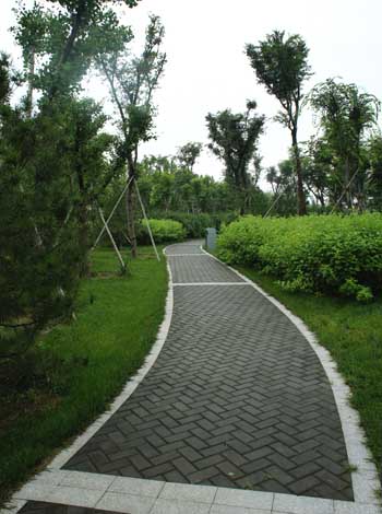 而在道路十字路口的節(jié)點(diǎn)處,則主要是用10cm×10cm的小花崗巖鋪地,鋪出來(lái)的路面整潔、平坦,看似簡(jiǎn)單,實(shí)則對(duì)施工技術(shù)要求相當(dāng)高。草坪中的地面鋪裝,則采用花崗巖汀步,用錯(cuò)縫鋪裝法,兩塊花崗巖之間用草皮鑲嵌,就像給每塊花崗巖鑲了一道綠邊,與旁邊的草坪和諧地融為一體。貫穿整個(gè)工程的游憩步道,全部采用“人字形”的鋪裝方法,中間用透水磚、兩邊以花崗巖鑲邊,透水磚價(jià)格不高,用以鑲邊的花崗巖是利用了鋪裝中剩余的邊料,雖然用料簡(jiǎn)單,但通過(guò)對(duì)技術(shù)的嚴(yán)格要求,鋪出的路面卻整潔而不失韻味,是一種實(shí)用、環(huán)保、節(jié)約的做法。