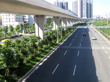 如今,開車行進在這條道路上,干凈整潔的路面、開闊通透的視野、清新自然的景觀,給人帶來閑適、愜意的感覺?!耙匀藶楸?,尊重自然”的綠化理念,體現(xiàn)在景觀中的每個細節(jié);自然環(huán)境與城市環(huán)境的密切結合,使高架橋的道路通行功能與橋下中央綠化帶的生態(tài)功能有機融合。整條道路,不僅體顯出深圳這個濱海大都市獨有的景觀特色,更彰顯出這個城市的生機活力與熱情奔放。