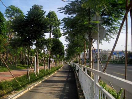 眼前的這條道路開闊大氣、綠色生態(tài),而當初施工時,卻面臨著很多難題。該項目定位較高,工期短,交叉施工嚴重,更經(jīng)歷了濱海的臺風季節(jié)天氣,所以施工中對施工工序組織、材料組織及機械勞動力的組織顯得尤為重要;由于施工范圍處于交通繁忙的205國道深圳段,對施工現(xiàn)場車輛的疏導及路邊作業(yè)的圍護等的要求都需嚴格把控;為了保證景觀效果,對苗木的要求比較高,很多假植的苗木需要用保鮮的方法長途運載到施工現(xiàn)場進行種植?!笆┕ぶ忻媾R的各種不利因素不但增加了工程成本,更加大了施工難度,但在項目部全體人員工的共同努力下,最終克服種種困難,圓滿完成了任務,展現(xiàn)了杭州市園林綠化工程有限公司優(yōu)質高效、創(chuàng)新進取的企業(yè)形象,受到各方的一致好評。”徐向明的一番簡短話語,卻讓我們感受到了施工期間的諸多辛苦。