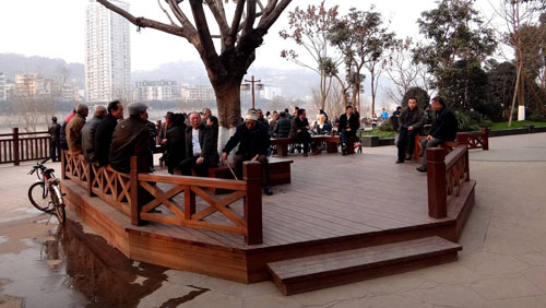 “我們將館驛嘴廣場(chǎng)的設(shè)計(jì)基調(diào)定位為‘奢華’, 是指使用的材料要‘真材實(shí)料’,施工工藝要經(jīng)得起考驗(yàn)。”李壽仁邊走邊介紹說,“漣漪廣場(chǎng)上的冰裂紋圖案鋪裝,采用兩種顏色的花崗巖,為了營(yíng)造出氣泡的效果,特意將圓形的花崗巖用不繡鋼鑲邊,加深色彩,形成對(duì)比,從而營(yíng)造出‘激起漣漪無數(shù)’的奧妙,實(shí)現(xiàn)館驛嘴這艘航船動(dòng)起來的效果,為了保證施工質(zhì)量,工人都是從杭州請(qǐng)來的專業(yè)人員;所有的青石鋪裝,全部采用人工石刻,我們現(xiàn)在看到的這些菠蘿面、荔枝面等紋路,是幾百名能工巧匠一鑿一鑿刻出來的,這種自然、厚重、原生態(tài)的質(zhì)樸美,是機(jī)器切割無法實(shí)現(xiàn)的,更重要的是,大量青石的運(yùn)用,可以有效抵抗洪水的沖刷,就算50年一遇的洪水來襲也不怕;反映瀘州民俗生活的三缺一麻將雕塑,則是用全銅制作,人物形態(tài)惟妙惟肖,紋路雕刻精致細(xì)膩,彰顯出工藝的用心和考究;亭、廊等木結(jié)構(gòu)建筑則采用實(shí)木制作,對(duì)木質(zhì)材料和厚度都有嚴(yán)格的要求,達(dá)到美觀與實(shí)用兼顧的要求。”