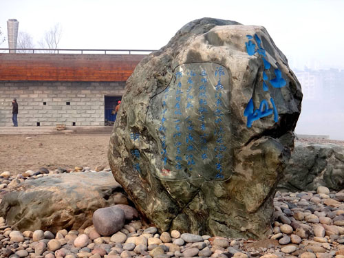 在臨近東門口廣場(chǎng)的地方,豎立著一塊高4米的整石無字碑,粗糙的碑身上下沒有一個(gè)文字,只有鐫刻的一行阿拉伯?dāng)?shù)字“2012.7.23”,以及記錄洪水水位高度的標(biāo)刻?!氨淼捻敳糠幸恢晃┟钗┬さ南?,取名為‘犀牛鎮(zhèn)河妖’,現(xiàn)在犀牛還沒做上去?!崩顗廴收f,“這塊無字石碑是讓瀘州人民永遠(yuǎn)銘記著2012年7月23日,洪災(zāi)肆虐酒城,洪水水位達(dá)到瀘州歷史最高水位的日子?!币粔K無字碑,勝過千言萬語的表述,卻讓人們銘記一段歷史。作為無字碑的原創(chuàng)者,李壽仁希望借此表達(dá)酒城人民希望今后洪水不再肆虐、家人永遠(yuǎn)平安的祈盼。再仔細(xì)觀察才發(fā)現(xiàn),這塊石碑的四個(gè)角、四個(gè)面的處理方式和紋路都各不相同??此茻o字,實(shí)則意蘊(yùn)深遠(yuǎn),如此創(chuàng)意,讓人暗暗稱妙。