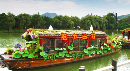 藝術(shù)節(jié)期間,首次在西湖湖面上配置的6艘荷花花船,極大地提高了荷花節(jié)的觀賞性和趣味性,成為西湖中一道流動(dòng)的荷花美景。其中,由杭州市園林綠化股份有限公司設(shè)計(jì)制作的“魅力西湖”荷花游船,將插花技藝與園林布景手法有機(jī)結(jié)合,用康乃馨、勿忘我、太陽花等與荷花組景,既突顯了“主角”荷花的秀麗、典雅,又使整艘船的色彩明艷豐富,將熱鬧的節(jié)日氛圍巧妙烘托。