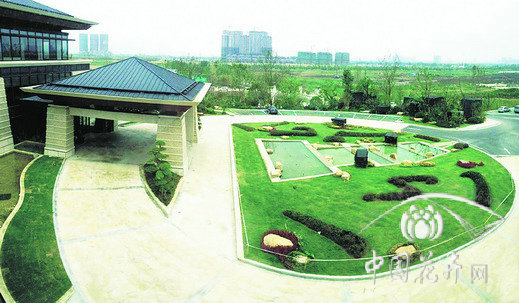 如2號樓大廳門前,在大面積草坪上,選用紅花檵木、金邊胡頹子、茶梅等一些小毛球,用中國書法的用筆法則,十分簡潔地“書寫”出點、橫、豎、鉤、提、撇、短撇、捺,即代表中國書法中筆畫大體的“永”字八法,這種匠心獨運的植物配置,將園林造景手法與中國書法藝術完美配合,在園林景觀中融入了中國深厚的文化底蘊,景觀效果令人耳目一新,使酒店整體景觀品位得到提升,是中國傳統(tǒng)園林造景手法的典型運用。