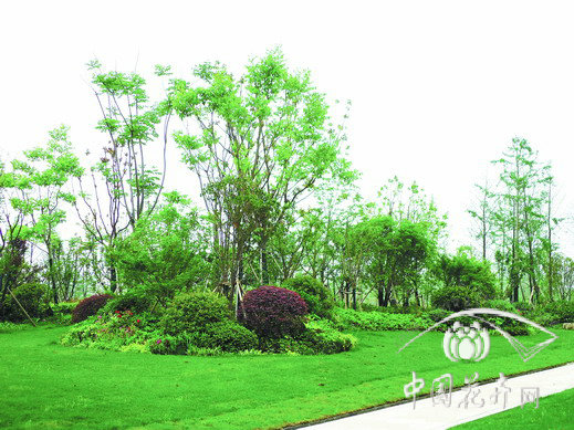 在1號樓和2號樓之間,植物配置講究層次錯落有致、季相色彩豐富多變、天際線分明起伏、林緣線和草坪線視覺流暢,遵循大自然本身的多樣性、群落性、生態(tài)性原則,營造出對比強烈、富有節(jié)奏和韻律感的園林景觀。其中,高層主要用榔榆、香樟、櫸樹、落羽杉,中層用桂花、紅楓、雞爪槭、白玉蘭,低層用紅梅、石楠、紅花檵木等,在有限的空間里,營造出變化多端的園林景致,特別是大規(guī)格造型植物的應用,更是起到了畫龍點睛的作用。