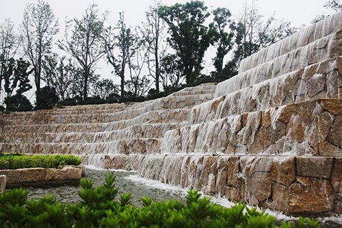 入口水景開闊大氣,行道樹陣整齊劃一。一場歌劇的序曲,不管是澎湃激昂,還是歡快活躍,抑或是柔情舒緩,都將對整個局情起著舉足輕重的作用。入口景觀的作用同樣如此,它是整個園林工程留給人們的第一印象。走進(jìn)項(xiàng)目主入口,寬40米、高10米的寬闊水景,高達(dá)7級的層階落差,水流層層跌落間,水聲轟鳴,仿佛一道瀑布橫掛眼前。3000平方米的地面鋪裝,全部采用50毫米厚的深灰色和芝麻白花崗巖,走在上面,平坦、踏實(shí)。兩側(cè)的花壇,邊緣鋪設(shè)手法也呈臺階狀,蘑菇石貼面,花崗巖壓邊,與水景遙相呼應(yīng)?;▔械闹参?,上層選用香樟、銀杏、櫸樹,中層用櫻花、紅葉李,下層用麥冬、水蠟、花石榴及草花,再加上造型樹的點(diǎn)綴,營造出群島效果,使得整個入口景觀莊重典雅,大氣天成。