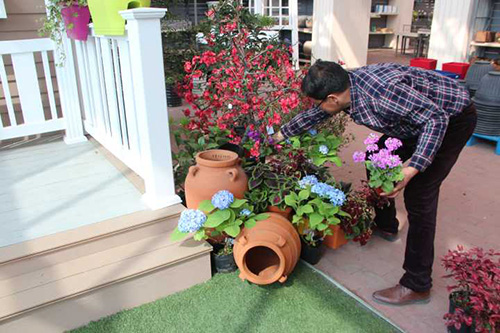 ▲我們選擇園藝中心室內(nèi)一處小木屋的陽臺(tái),作為造景點(diǎn)。園藝師現(xiàn)場查勘后,初步確定花境布置點(diǎn)的面積和風(fēng)格。