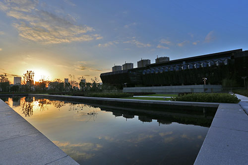 項目入口廣場處的靈動噴泉、唯美浪漫的水上舞臺、時裝館溫馨自然的庭院、宛如飄帶的戶外連廊……園林與建筑有機融合,突出絲綢文化與特色,講好流光溢彩的“絲綢故事”。