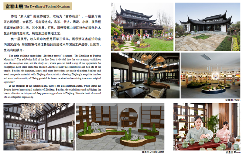 浙江園內體現(xiàn)“浙人家”的主體建筑取名為“富春山居”,該建筑以浙派民居為原型,飛檐翹角,格局大氣,盡顯浙江風情。深化這個建筑單體,團隊做了很多功課,花了許多心思,考察了許多浙江特色民居,在充分運用現(xiàn)代建筑材料與結構的基礎上,通過對浙江傳統(tǒng)民居建筑的經典片段提取和抽象提煉,賦予這些元素和符號以新的意義,構建出浙江傳統(tǒng)民居的新風貌。它不是對傳統(tǒng)民居建筑的照抄照搬,而是繼承和創(chuàng)新,設計了一棟獨一無二的建筑。