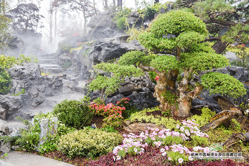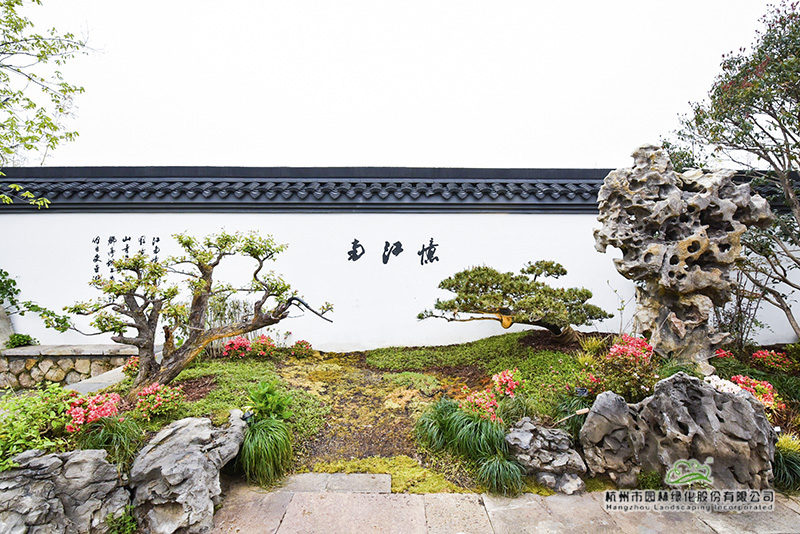 再往里走,富春山居照壁前的造型黑松和紅花檵木,一左一右,遙相呼應,樹姿優(yōu)美,枝干舒展,仿佛熱情歡迎遠道而來的客人。這兩棵樹,是深化設計團隊跑遍全國重要苗圃挑選回來的,讓最美的一面呈現(xiàn)在游客面前。