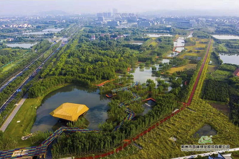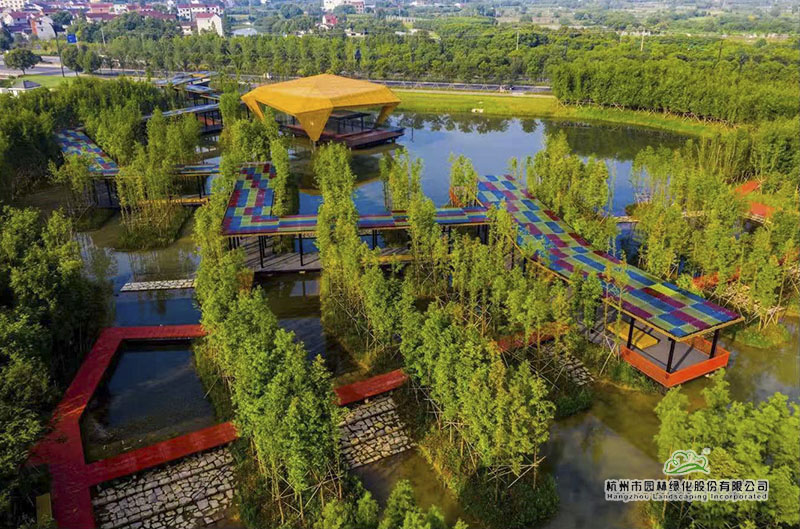 綠道建設(shè)充分融入海綿城市理念,從鋪裝材料的選擇到施工過程,均充分體現(xiàn)生態(tài)環(huán)保,與整個公園景觀和諧相融,集生態(tài)環(huán)保、觀賞游玩、休閑運動為一體。沿綠道而行,蜿蜒交錯約2公里的空中廊橋,讓人體驗林中穿梭、空中漫步;‘鉆石切割、珍珠光澤’的珍珠涼亭,夜晚,在燈光的折射下,會散發(fā)出迷人的光澤,猶如一串閃耀奪目的珍珠,璀璨奪目。從高空俯瞰,紅色的綠道在碧水綠樹中穿行,將沿途景觀有機串連,形成一幅風(fēng)格鮮明的生態(tài)風(fēng)景畫卷。