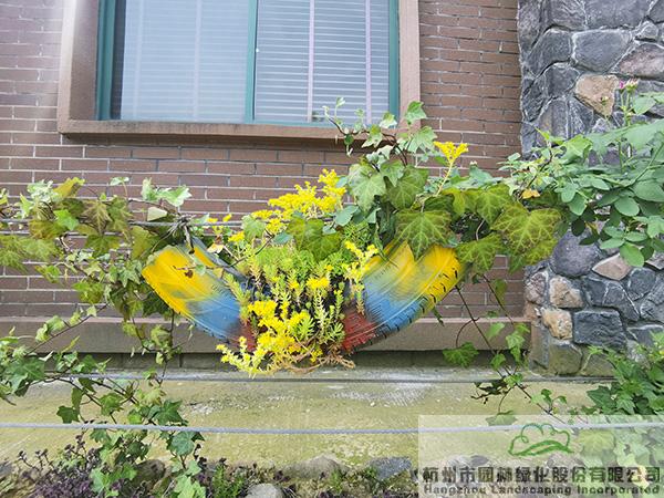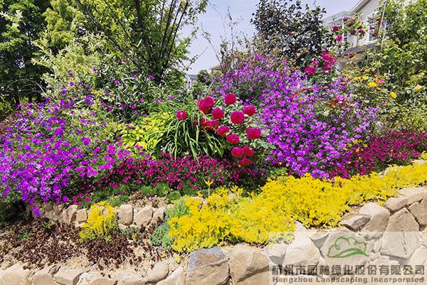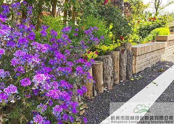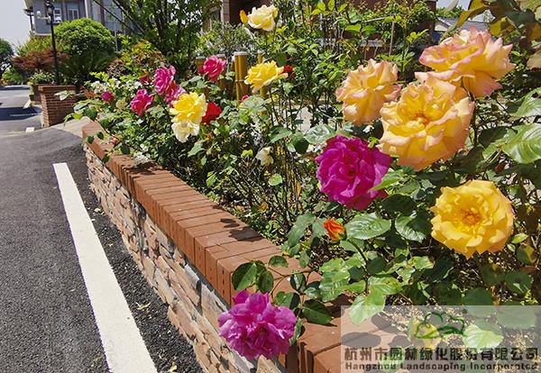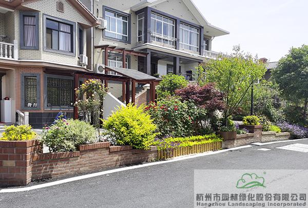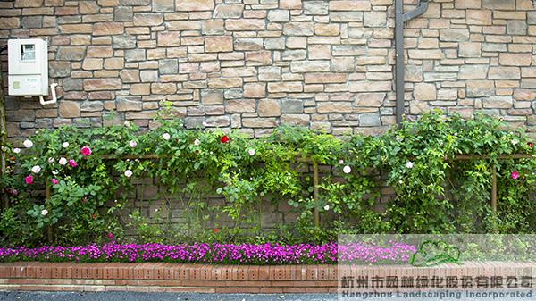 景墻邊的植物配置同樣有講究。利用銀杏、桂花、梅花、紅楓等植物營(yíng)造上層空間,這些植物具有遮擋作用,能夠?yàn)橥ピ籂I(yíng)造一定的私密空間。通過(guò)樹狀、球狀、攀援、傘狀、字母等各種形態(tài)的月季,金冠女貞球、龜甲冬青球、銀姬小蠟球、藍(lán)莓、八仙花、小葉梔子、翠蘆莉、花葉千鳥花、藍(lán)山鼠尾草、紫葉狼尾草等小喬灌木,在打造中層空間的同時(shí),和美女櫻、金娃娃萱草、花葉玉蟬花、花葉香桃木、紫菀、澤蘭、礬根、五彩絡(luò)石、石竹等下層空間植物一起,裝飾和襯托景墻,使家家戶戶的景觀更加豐富多變。