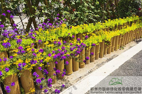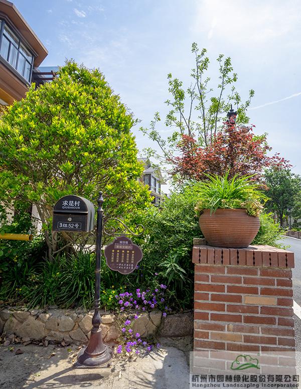 梅秋里的房屋多為兩到三層建筑,但建筑風(fēng)格、外墻立面均有區(qū)別,因此,在進(jìn)行景墻施工時(shí),根據(jù)每家的房屋建筑特色選擇了不同的材料和植物配置手法。比如,建筑外立面為紅色的,景墻以紅色磚為主,搭配月季、佛甲草等植物;建筑外立面為灰色的,景墻以淺黃色磚為主,結(jié)合小木樁或仿竹籬笆,搭配石竹、美女櫻等植物;建筑外立面有大理石點(diǎn)綴的,景墻以桐廬石為主,輔以裝飾過(guò)的輪胎,點(diǎn)綴佛甲草、常春藤等植物。不同的處理手法,使得家家戶戶的景墻既有連續(xù)性,又有各自的風(fēng)格。
