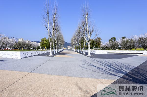 從各個廣場到沿溪綠道,全部采用透水混凝土材料,并在兼顧排水功能的同時,通過色彩、圖案的變化,營造移步換景的濱水景觀。廣場鋪裝主要選用深灰、淺灰、土黃等色彩的透水混凝土材料,根據(jù)現(xiàn)場景觀配色需求,設計不同的鋪裝組合,營造大氣自然、豐富多變的廣場景觀。靈溪公園入口處的波紋廣場,則以藍色透水混凝土材料為主,搭配亮麗的黃色,營造出流暢自然、色彩明亮的波紋效果,充滿了流動的旋律,再加上極富特色的異形樹池、坐凳,整個廣場又呈現(xiàn)出時尚的現(xiàn)代風情,帶給人們更加豐富的濱水景觀體驗。