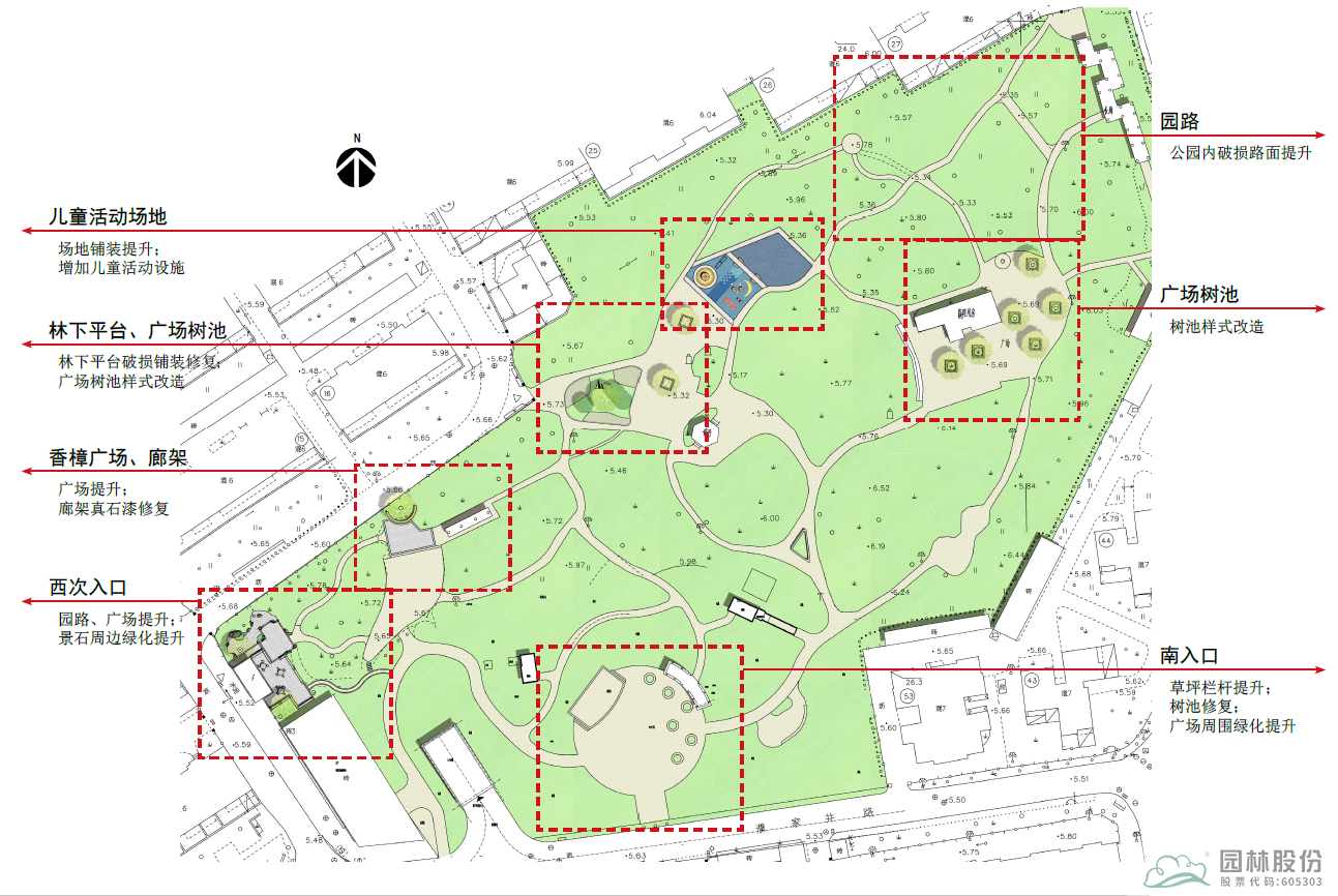 對公園內(nèi)破損路面及廣場進(jìn)行修補(bǔ);對通往公廁的園路進(jìn)行改造,鋪設(shè)瀝青;對被破壞的樹池進(jìn)行擴(kuò)大改造。