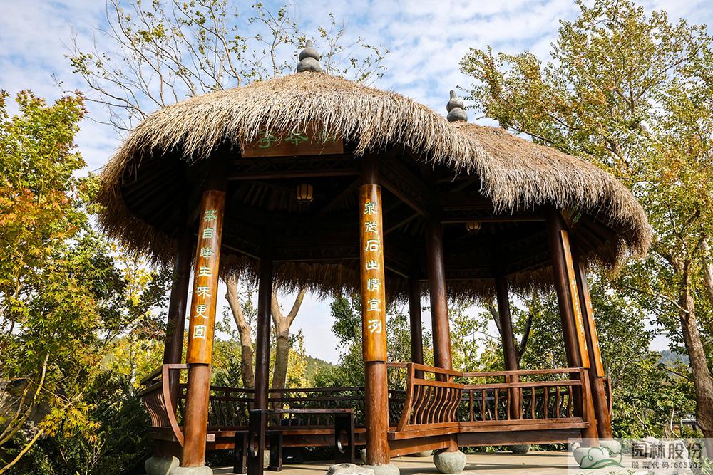 契合展區(qū)主題的樾香亭臨湖而立,雙坡屋面,八柱敞亭,柱子上書五言聯(lián)“魚樂人亦樂,泉清心共清”,盡顯悠閑舒適的情趣。在亭內(nèi)憑欄而坐,側(cè)耳聽風雨,迎風嗅花香。抬頭遠望,荷葉亭亭的水面上,有魚兒在水中嬉戲;曲折的長橋上,游人在漫步觀景;水岸邊,銀杏、三角楓、烏桕等色彩繽紛,編織出一幅深秋的美麗畫卷。