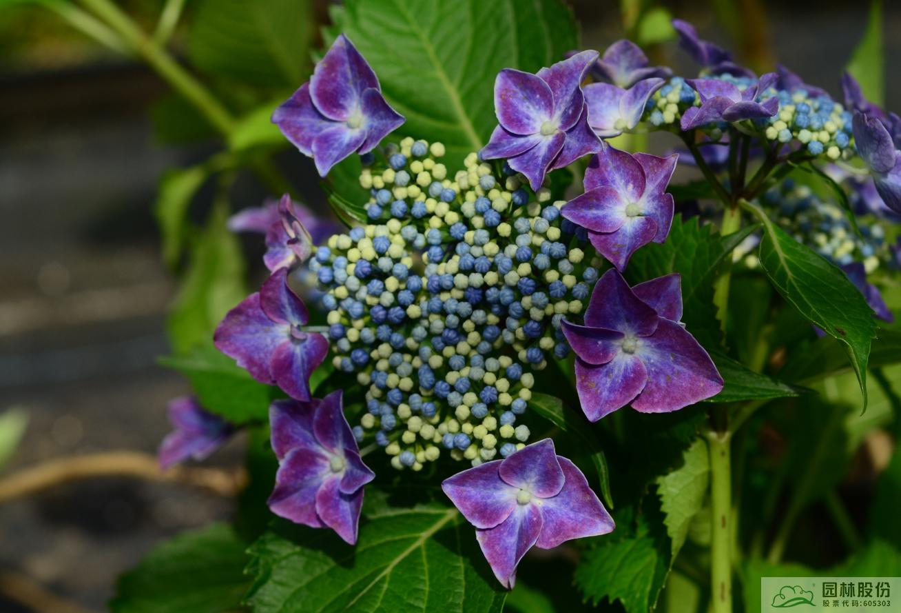 大葉繡球‘夢幻星空’:傘房狀聚傘花序盤狀,高度2~4cm,直徑10~12cm,上海及杭州5月中下旬開花,可延續(xù)至6月下旬;可孕花花瓣藍色;不孕花萼片先端白色至淺藍色中部藍色至紫色基部白色;花色夢幻,花型飄逸,適合家庭園藝和工程。