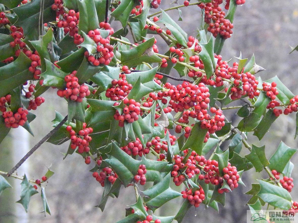 具柄冬青:又名長梗冬青,顧名思義,他的果梗是比較長的。細而長的果梗上長著一顆顆紅彤彤的小果實,宛若枝上掛著一盞盞小紅燈籠。2013年,榮獲美國冬青園藝學會年度冬青的稱號。適宜做園藝盆栽或庭院觀賞。