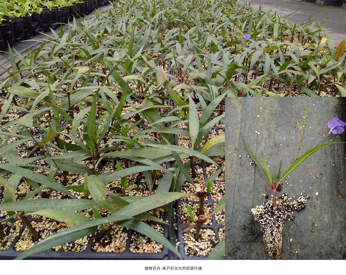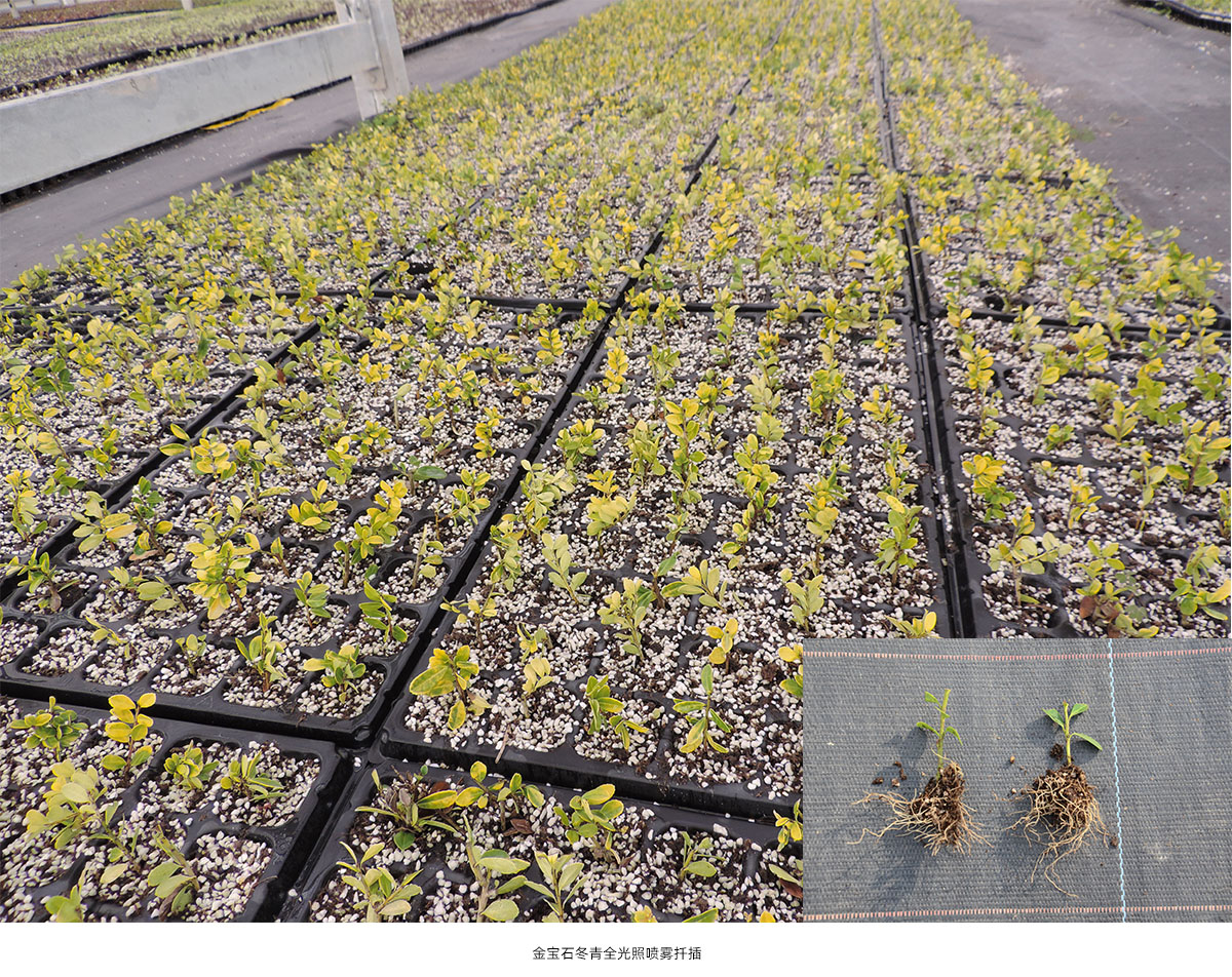 全光照噴霧扦插技術(shù)具有生根期短、成活率高和操作簡單等優(yōu)點(diǎn)。研究院已建立了桂花、冬青、降香黃檀、新優(yōu)宿根植物等數(shù)百種植物的全光照噴霧扦插技術(shù)體系,年度育苗量200多萬。